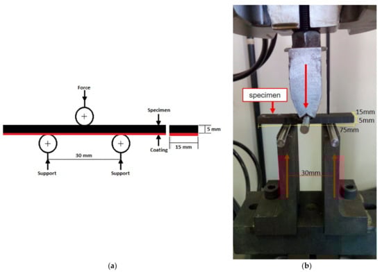 The 3-point bending fatigue test was performed by MTS Landmark 370.02 to give the S-N curve of each coating group. The tests were evaluated according to ASTM E466-07 and ISO 22407:2021 standards. The applied parameters were 30 Hz frequency, a loading ratio R of 0.1, a limit of 5 × 106 cycles, cylinders of 5 mm diameter as the supports and plunger, and a 30-mm spam. At least two specimens were tested for each maximum cyclic stress level between 560 MPa and 340 MPa. Figure 1 shows the configuration of the specimen in the 3-point bending fatigue apparatus, where the spacing between the supports was fixed at 30 mm to achieve bending and to avoid shear stresses. Figure 1a shows the schematic of the specimen and the position of the coating in the fatigue test apparatus, whereas Figure 1b exhibits the specimen and its positioning in the fatigue equipment.
