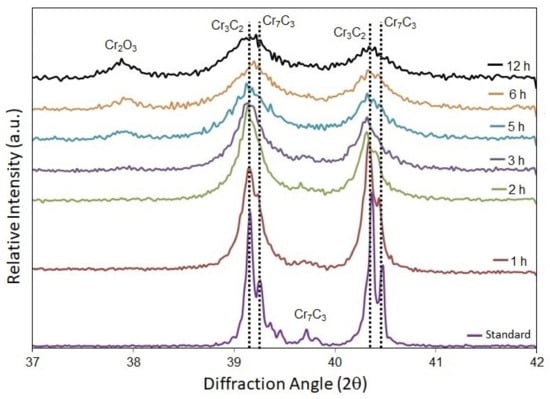 Figure 2 explains the XRD analysis applied to the original Cr3C2-25NiCr spraying powder as a function of high-energy milling time, indicating the formation of Cr3C2 and Cr7C3 during the HEM process. This formation has been reported in the literature by other authors [,,,,,].