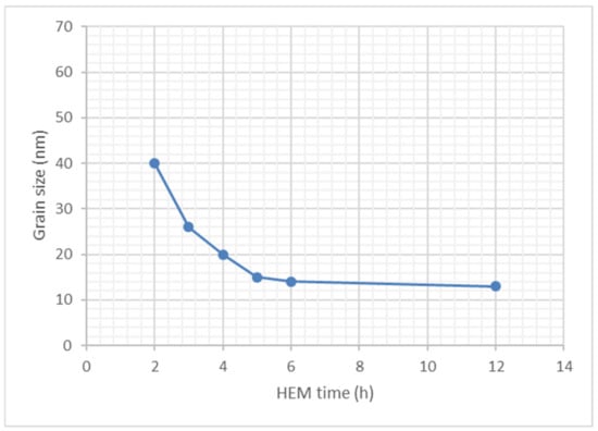 The Pulverisette 6 planetary mill, equipped with a steel-coated grinding jar and 5 mm zirconia balls as the grinding media, was used to evaluate the effectiveness of the HEM method. The mass spheres/raw material ratio was 5:1. The adopted milling speed was 800 rpm; 20 mL of ethyl alcohol and 3 wt% of alumina were used as the milling medium to increase the grinding efficiency []. After milling for 12 h, the powder was oven dried at 60 °C for 20 min and sieved to 325 # (45 µm) according to the recommended protocol [].