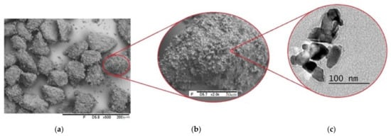 SEM images of the Cr3C2-25NiCr milled particles. (a) Sets of milled particles agglomeration. (b) Agglomerated milled particles in more detail. (c) TEM images showing the irregular shape of single-milled particles.