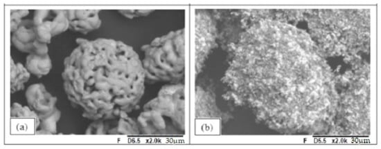 SEM images of (a) the original spraying powder and (b) after HEM spraying powders.