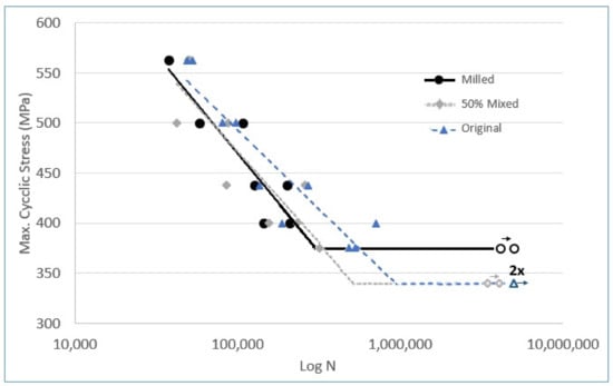 S-N curves of the coating produced from HEM-milled, original, and 50% mixed spray powder. The open dots represent specimens that did not fracture during the fatigue test.
