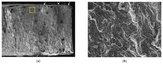 (a) Representative SEM image of the coated specimen fracture. The ratchet marks (some of them are highlighted by arrows) at the top of figure indicate fatigue nucleation sites. Crack propagation is identified by the smooth surface preceding the final fracture. (b) Fatigue striations perceived on the region highlighted in (a).