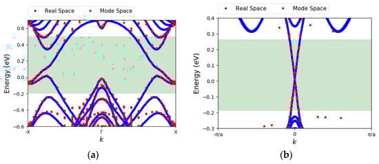 (a) The electronic band dispersion of 4 nm wide zigzag stanene ribbon with fluorine edge passivation, calculated by real space (RS) Hamiltonian and mode space (MS) Hamiltonian. The green-shaded region indicates the target energy window (b) same as (a) for a 7 nm wide zigzag bismuthene ribbon with H edge passivation.