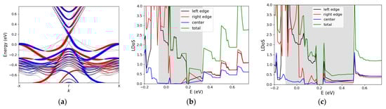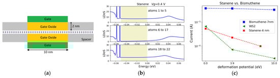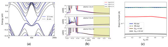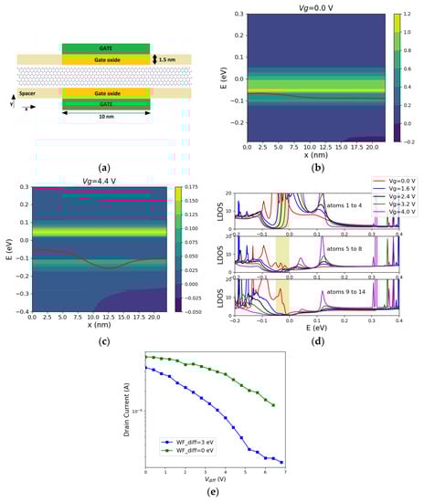 Figure 7b,c show the energy-resolved current spectrum, for Vleft = 0 and Vleft = 4.4 V, respectively. The voltage on the other gate is Vright = 0 V. Additionally, Lch = 10 nm, VDD = 0.05 V and a doping concentration of 3 1020 cm−3 is introduced to shift the Fermi level. A gap of around 0.1 eV is observed in the device with Vleft = 4.4 V (Figure 7c), which confirms the opening of a gap by the external lateral electric field.
