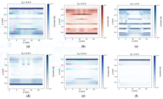 (a) The atom resolved current of forward moving spin-up electrons in the device under Vg = 0.4 V and VDD = 0.05 V (the ballistic case), (b) same as (a) but for the spin-down electrons. (c): Same as (a) for Vg = 1.2 V. (d): Same as (a) but for backward moving spin-up electrons. (e,f): Same as (a) for DAC = 4 eV and DAC = 10 eV, respectively.