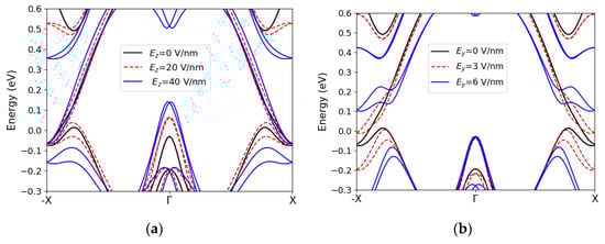 Figure 6 illustrates the electric-field-induced changes in the band dispersion of stanene and bismuthene. Figure 6a shows that, by applying an out-of-plane field (Ez), a gap opens at the X point in the edge states of the stanene zigzag ribbon However, the unprotected states around the point move up into the gap as well. In Figure 6b, we see that the lateral field (Ey) opens a gap at the X point as well, using an about 10× reduced field. The gap is around 0.13 eV for Ey = 6 eV/nm. However, the states around remain unchanged, as they are mainly formed by the middle atoms. In bismuthene, both lateral and out-of-plane fields shift the protected and unprotected states and close the bulk gap (Figure 6c,d). Once the bulk gap is closed, the spin-polarized states cannot be isolated anymore. Therefore, the transport will be unprotected. In addition, the lateral field seems to have a more drastic influence on the energy dispersion compared to Ez in bismuthene. It can be inferred that the lateral field can tune the band structure in a different way than the out-of-plane field, and in some materials, it can be more advantageous to use the lateral field.