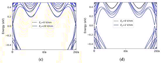 Band structure of a 2.5 nm wide stanene zigzag ribbon under (a) an out-of-plane electric field (b) a transverse electric field. Band structure of a 4 nm wide zigzag bismuthene ribbon under (c) an out-of-plane electric field (d) a transverse electric field.
