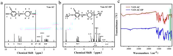 1H NMR spectra of VAN-AC (a) and VAN-AC-EP (b); FT-IR spectra of VAN-AC and VAN-AC-EP (c).