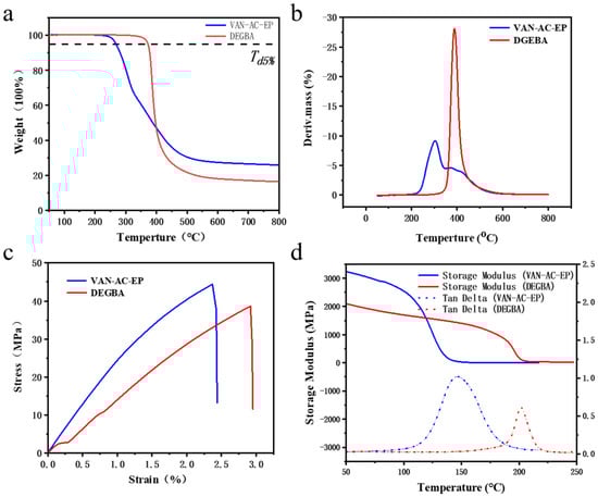 (a) TGA curves, (b) DTG curves, (c) stress–strain curves and (d) DMA curves of VAN-AC-EP/DDM and DGEBA/DDM.