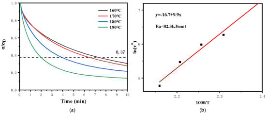 The ductility of VAN-AC-EP/DDM was tested by stress relaxation experiments. In Figure 4a, four temperatures of 160, 170, 180 and 190 °C were selected for testing. Due to the large number of dynamic covalent bonds in VAN-AC-EP/DDM, an obvious relaxation phenomenon occurred. The higher the temperature was, the more obvious the stress relaxation phenomenon was, fully showing the temperature dependence. When the temperature was higher than Tg, the relaxation time τ followed Arrhenius’ law [35]: