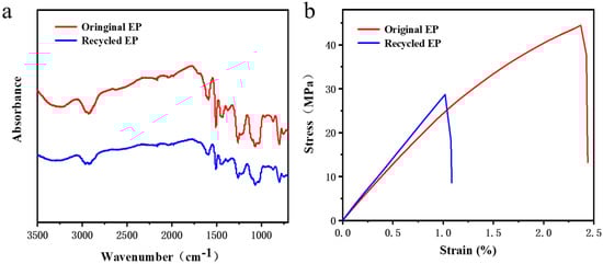 (a) FT-IR spectra and (b) stress-strain curves of the original and recovered VAN-AC-EP/DDM.
