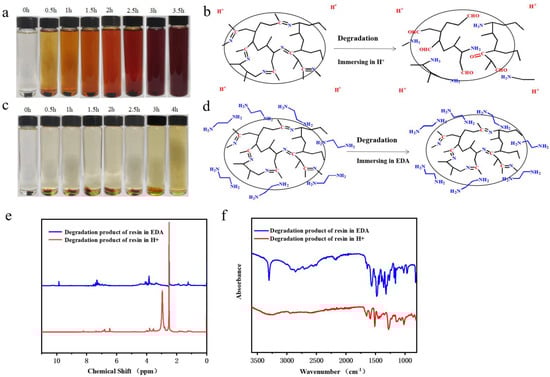 Degradation of VAN-AC-EP/DDM. (a) Digital photos of resin in acetone/HCL solution with a volume ratio of 6/4 and (b) degradation mechanism. (c) Digital photos of resin in EDA and (d) degradation mechanism. Structural characterization: (e) 1H NMR and (f) FT-IR spectra of VAN-AC-EP/DDM after degradation in H+ and EDA.