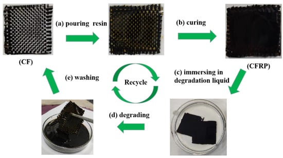 Carbon-fiber-reinforced polymer composites (CFRP) are widely used in aerospace, wind turbine blades, automobile parts and other fields due to their advantages of high modulus, high strength, low density and corrosion resistance [1,2,3,4]. The polymer substrates in CFRP include epoxy resins, dual maleimide resins and polyimide resins. Epoxy resins are some of the most significant thermosetting polymers, contributing good thermal and mechanical properties, chemical resistance and adhesion [1]. However, more than 90 percent of thermosetting epoxy resins are prepared from bisphenol A glycidyl ether (DGEBA) [5,6]. These traditional DGEBA epoxy resins are derived from fossil resources. The permanent cross-linked networks formed within the resins make them non-degradable and non-reprocessing composites. Recycling by landfill incineration causes a huge burden on the environment. These methods may reduce the quality of carbon fiber and greatly reduce its commercial value [7,8,9,10]. Therefore, finding how to gently recover waste thermosetting epoxy resin and then recover the high-cost carbon fiber has become a primary problem.