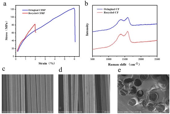 (a) Stress-strain curves of original CFRP and recycled CFRP; (b) Raman spectra of original CFRP and recycled CFRP. SEM images of (c) original CFRP, (d) recycled CFRP and (e) CFRP cross section.