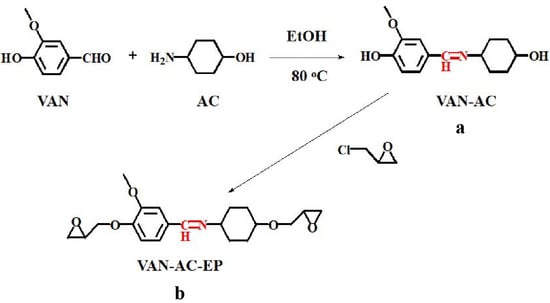 As shown in Scheme 1, the synthesis of vanillin-based epoxy monomer (VAN-AC-EP) was divided into two steps. First, as shown in Scheme 1, 45.6 g (0.3 mol) vanillin and 34.5 g (0.3 mol) 4-aminocyclohexanol were dissolved in 200 mL of ethanol with stirring, and the mixture was refluxed at 80 °C for 2 h. The yellow solid that precipitated from the solution was filtered and washed with ethanol three times. After drying in an oven at 50 °C for 1 h, a yellowish powder (VAN-AC) was obtained. The yield was 84.2%.