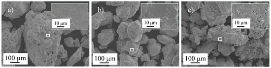 During the first 5 h of MA, the particles plastically deformed and became flattened (Figure 4a) as a result of the high ductility of the raw metallic powders [28]. From 5 to 10 h of MA (Figure 4b), a decrease in the average particle size of the mixture occurred, resulting from a fracture process, due to the work hardening of the particles by plastic deformation [29]. After 25 h of MA (Figure 4c), the particles were quite irregular and of different sizes. It was concluded from the EDS elemental analysis that the metallic mixture MA’ed for 25 h was quite homogeneous chemically (Figure 5). Intense peaks of tin were present in the 25 h mechanically alloyed mixture, together with lower intensity peaks of Zn and Bi (lower concentrations in the mixture).