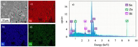 (a) SEM image and (b–e) EDS analysis of the Sn89-Zn8-Bi3 mixture after 25 h of MA.