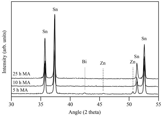 The XRD patterns of the Sn89-Zn8-Bi3 mixture as a function of the MA time are presented in Figure 6. After 5 h of MA, the diffraction peaks of the Sn, Zn, and Bi were still detectable. After 10 h of MA, the diffraction peaks of Zn were no longer detected, meaning that the dissolution of the Bi atoms into the Sn lattice had occurred. After 25 h of MA, the XRD pattern of the mixture showed only the diffraction peaks of Sn. It was likely that the Zn and Bi atoms were incorporated into the Sn lattice. However, no significant shift of diffraction peaks of Sn was observed, due to the similar atomic radii of these elements (1.45, 1.42, and 1.43 Å for Sn, Zn, and Bi, respectively). Similar results were obtained in a previous work on this system [30].