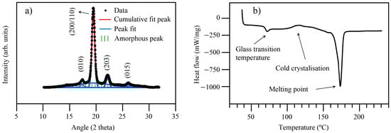(a) XRD peak deconvolution and (b) DSC results from the cast PLA.