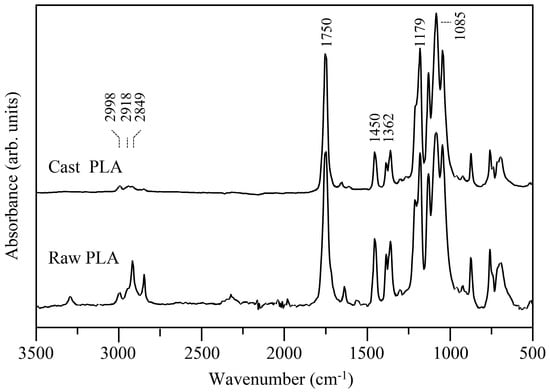 The FTIR results of the raw and cast PLA samples are shown in Figure 9. The IR spectra were quite similar, and only small variations of the intensity of the peaks were observed. This means that during casting, the polymer remained quite stable, and no changes in its chemical composition occurred. The IR spectra showed a strong band at 1750 cm−1, ascribed to the C=O bond stretching, some bands in the range of 3000 to 2850 cm−1, assigned to the C-H stretching of -CH3, and the characteristic absorption of ester C-O, which stretches at 1179 cm−1.