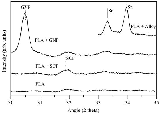 The XRD patterns of the cast samples are shown in Figure 10. The characteristic diffraction peak of GNP was placed at 2θ = 33°. The diffraction peak of the SCF (2θ = 31.8°) was superimposed on the PLA diffraction plane. Concerning the PA sample, the characteristic peaks of Sn could be seen in the diffraction pattern. Therefore, based on these results, one might conclude that all the fillers were present in the cast samples.
