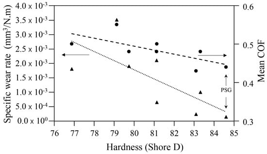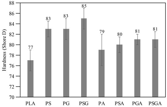 As mentioned before, hardness and tribological tests were performed on all the samples. The Shore D hardness values are presented in Figure 11. The hardness measured for PLA was 77 Shore D, which agrees with the value indicated by Teymoorzadeh and Rodrigue [32]. All the composite samples presented higher hardness values than the PLA. The highest hardness was obtained for PSG (84.5 Shore D, corresponding to a 10% increase in hardness compared with PLA). The PS and PG samples presented the same Shore D hardness (83). Similar results were obtained by other authors, who claimed that hardness increased when either GNP or SCF was added to polymer-based composites [33,34,35,36,37,38].