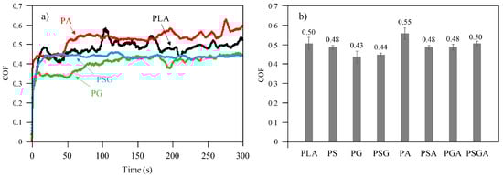 Figure 12a,b illustrates the variation of the COF as function of time (maximum of 300 s) curves of the PLA, PG, and PA samples, as well as the average coefficient of friction of all of them, respectively. These COF curves were selected because they corresponded to three different tribological behaviors.