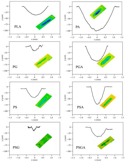 The 3D profilometry images of the wear scars and the corresponding wear profiles of the samples after the tribological tests are presented in Figure 13. The corresponding specific wear rates are illustrated in Figure 14. Figure 15 shows the SEM images of the wear scars of the samples. The PSG and PG samples presented the lowest wear depth values (~6 and 11 µm, respectively), significantly lower than the wear depth value of the PLA sample (~40 µm). The PA sample presented the highest maximum wear depth of ~110 µm.