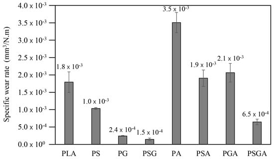 Concerning the specific wear rates, the PLA sample presented a value of 1.8 × 10−3 mm3/N·m. The PSG sample had the lowest value (1.5 × 10−4 mm3/N·m), reduced by 12 times compared to PLA. The PG sample also showed a low specific wear rate (2.4 × 10−4 mm3/N·m). The PA sample showed the highest value (3.5 × 10−3 mm3/N·m), two times higher than the PLA. All but the PSGA samples reinforced with Sn89-Zn8-Bi3 showed lower wear resistances than PLA. This was particularly true for the PA sample with no GNP or SCF. Its low adhesion to the PLA granules may be the reason for this behavior. An increase in the wear resistance by integrating GNP into the PLA matrix was reported by Ustillos et al. [55]. In the same way, Friedrich [56] showed that SCF can effectively increase the wear resistance of PEEK + PTFE engineering polymers. Both SCF and GNP were harder than PLA, which led to a higher wear resistance. Moreover, SCF increased the higher load-bearing capacity contact area, resulting in a higher wear resistance for these composites.