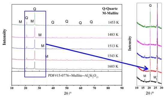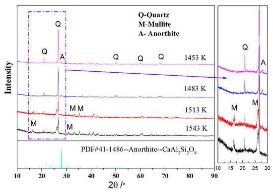 Figure 2 and Figure 3 exhibit the XRD patterns of R and M at different temperatures, respectively. The main crystal phases of the raw material were mullite and quartz (Figure 2). The new crystal phase of anorthite was observed in the XRD spectrum of M at 1453 K (Figure 3). The background peaks of M at 1513 K and 1543 K were attributed to the large amount of amorphous phase [25,26,27]. In the raw material (M) with the traditional three-component system, the XRD peak intensities of quartz decreased with the increase in temperature, while the XRD peak intensities of mullite increased with temperature, indicating that the increase in temperature enhanced the formation and growth of mullite. The reduction in the XRD peak intensities of quartz was attributed to the formation of a large amount of glass phase, which melted the quartz at high temperature. After adding additives, the changes in the XRD peak intensity of mullite and quartz were similar to that in the raw material, while the XRD peak intensities of anorthite first increased and then decreased before finally disappearing.