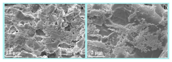 SEM images of R and M are shown in Figure 4 and Figure 5, respectively. The microstructure of the dense sintering body consisted of crystals, glass, and pores (Figure 4a). The crystal phases of R were mullite and quartz (Figure 2), which were combined by the glass phase. The circular pore in samples would decrease the bulk density and increase the water absorption. The mullite crystal was of benefit in increasing the mechanical performance of the ceramic. The higher aspect ratio of mullite would contribute to the higher bending strength of the ceramic. The length of the mullite crystal was mostly less than 0.5 μm in R at 1603 K (Figure 4b).