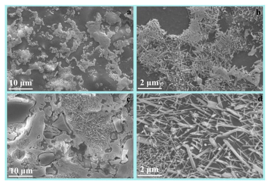 SEM images of M at 1513 K (a,b) and 1543 K (c,d).