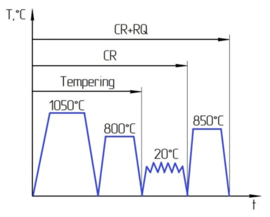 Plates with dimensions of 28 × 14.5 × 85 mm were made from steel bars with a diameter of 40 mm after tempering. The samples were rolled at room temperature to a reduction of 50% by cold rolling (CR) on a laboratory rolling mill at a speed of 1.5 m/min and a reduction of 0.5 mm per pass. The cold rolled samples were subjected to heat treatment above the temperature of the ferrite–austenite phase transition (850 °C, with exposure for 30 min), followed by oil quenching (CR + requenching) (Figure 1).