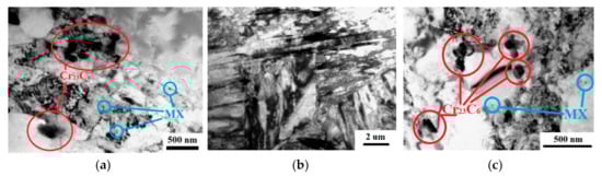TEM analysis of the structure evolution after fatigue tests of CR + requenched samples showed that an increase in the volume fraction of carbides is also observed directly near the fracture zone and caused by the activation of diffusion processes during rolling (Figure 9d–l). However, there is a uniform distribution of particles belonging to Cr23C6 both in the grain body and along the boundaries. Figure 9h–l show that the grains have twin boundaries with an average width of 273 ± 23 nm and contain a high dislocation density. As we move away from the fracture zone, the volume fraction of carbides decreases to 8% (Figure 10c).