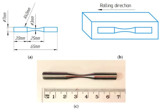 (a) Drawing of the fatigue test sample, (b) scheme of cutting samples for fatigue testing from CR specimens, and (c) photo of specimen for fatigue test.