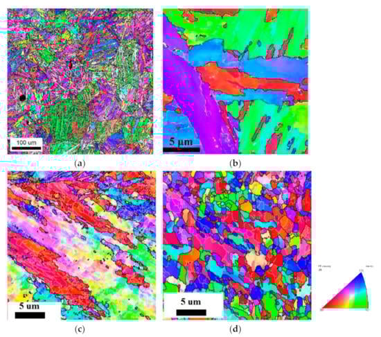 The microstructure of the samples after tempering, CR, and CR + requenching was investigated using electron backscattered diffraction (Figure 4, Table 2). After tempering, the coarse-grained structure with a mean grain size of 150 μm was observed. Plates with an average width of 5 μm were visible inside the grains. (Figure 4b, Table 2). Numerous plates could be seen inside one grain (Figure 4a,b). The application of CR led to the appearance of elongated grains (Figure 4c) and increased the fraction of the high-angle boundaries (HAB) to 44%, while the fraction of boundaries with the coincidence site lattice (CSL) relationships (the CSL boundaries) and twin boundaries (Σ3, Σ11) significantly decreased (Table 2). For the CR + requenched samples, a more uniform microstructure with a mean grain size of 0.9 μm was observed (Figure 4d). The volume fraction of the HAB slightly decreased to 34%, but at the same time, there was an increase in the fraction of the CSL and twin boundaries.