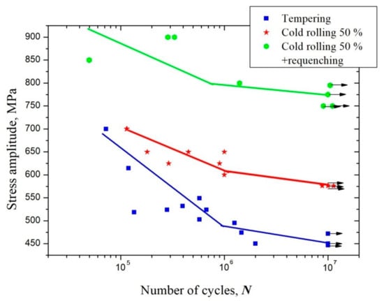 Figure 5 shows the S–N diagram of the samples after tempering, CR, and CR + requenching. The fatigue endurance limit based on 107 cycles increases from 450 MPa after tempering to 590 MPa after CR. The application of the heat treatment above the ferrite/austenite phase transition temperature allows for an additional increase in the fatigue endurance limit up to 800 MPa, which is 70% higher than the limit achieved after the tempering.