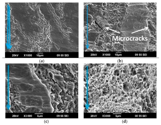 The fracture surface after CR in the sections: (a) zone 1; (b,c) zone 2; and (d) zone 3. SEM images. The blue arrows indicate the direction of crack propagation.