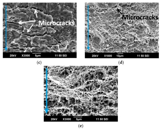 Fractographic studies of the fracture surface of the CR + requenched samples showed that the crack initiation starts at the surface defects. The crack initiation zone 1 (Figure 6b, zone 1) is characterized by scars located in the direction of the crack propagation (Figure 8a). The surface in the zone of the crack propagation is characterized by clearage facets and fatigue striations. At larger magnifications (×1000), a dimpled appearance which is typical for ductile fracture was observed. Numerous secondary cracks developed perpendicular to the direction of crack propagation, which is a result of the local stress relaxation (Figure 8b–d). The rupture occurred visibly with the formation of pits. The size of the pits ranged from 1 to 15 microns, inside which particles of 0.5–2 microns were observed (Figure 8e).