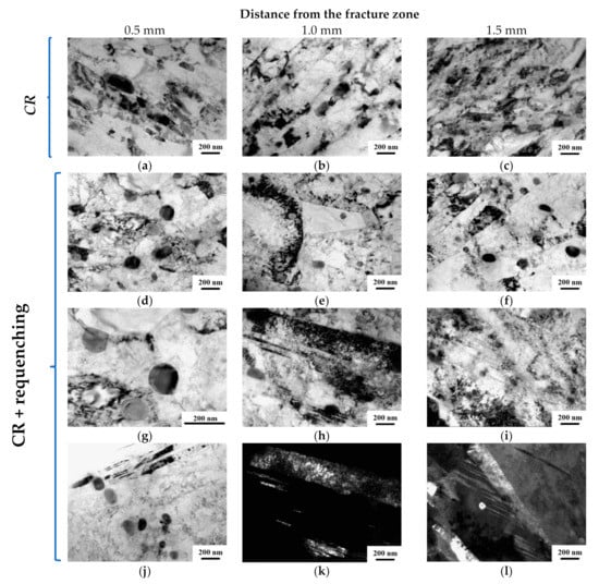 Microstructure of the CR and CR + requenching samples after fatigue tests at a distance of 0.5, 1.0, and 1.5 mm from the fracture zone. TEM images: (a–j) bright field, (k,l) dark field.