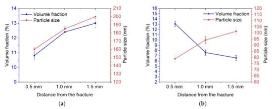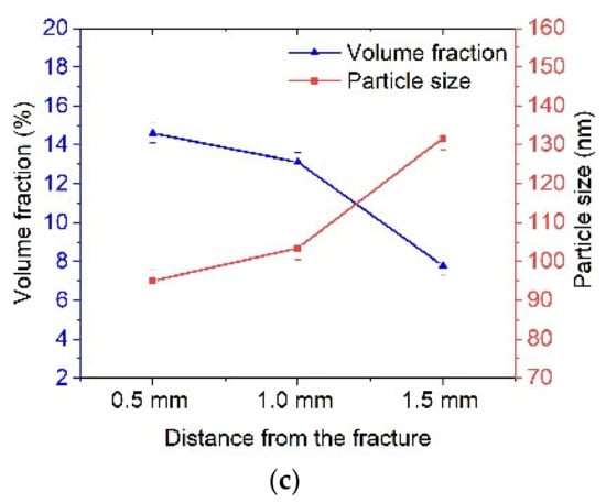 As can be seen from Figure 10, the volume fraction of particles in the fracture zone increased from 6–8% up to 12%, while smaller particles in the order of 80 nm were also observed.
