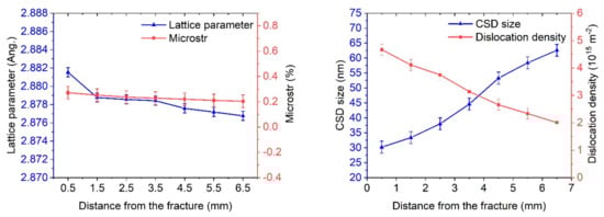 Changes in the structural parameters of the steel after fatigue tests depending on the distance from the fracture zone: (a) tempered sample, (b) CR sample, and (c) CR + requenching sample.