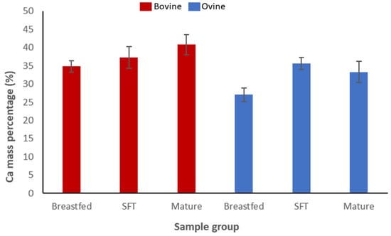 The values of the bovine samples ranged between 34% and 41% of the Ca content, while for the ovine samples, the results were between 33% and 36% (for breastfed and mature samples, respectively) as depicted in Figure 2 and Table 2.