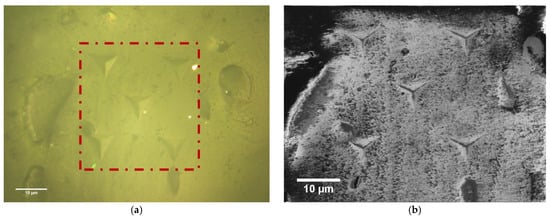 Typical imprints left by the nanoindenter for bone tissue. (a) Optical microscopy image of 5 isolated indentations at a depth of 2000 nm. (b) SEM image of five isolated indentations at a depth of 2000 nm. The distance between each indentation was 25 µm for both images.