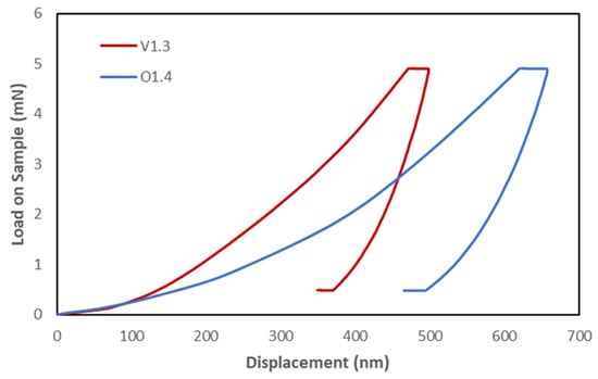 Lastly, the elastic modulus of each sample was characterized by instrumented indentation analysis. Nanoindentors can continuously measure force and displacement as the indentation is performed, avoiding the limitations of optically measuring the imprints.