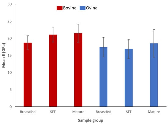 Figure 5 shows a clear trend of increasing the elastic modulus with age for juvenile specimens for either species. The mean numerical values of the elastic modulus for breastfed bovine bones are 18.7 ± 2 GPa, 21.1 ± 2 GPa for solid-food transitioning animals (SFT), and 21.5 ± 2.6 GPa for mature specimens. The average values of the modules for the ovine specimens were 17.4 ± 2.8 GPa for breastfed animals, 17± 3 GPa for solid-food transitioning, and 18.5 ± 4 GPa for mature bones.