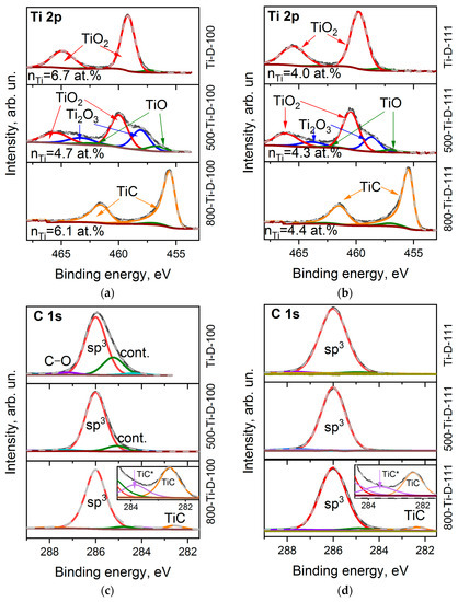 Figure 4a,b shows the Ti 2p XPS spectra of the Ti-coated diamond substrates. Before annealing, the spectra consist of two spin-orbit doublets showing dominant components at 459.8 and 465.4 eV assigned to TiO2 [47,48] with a small low-energy shoulder. The absence of a signal from metallic titanium (Ti 2p3/2 at 453.8 eV [49]) indicates complete oxidation of titanium by air molecules during the synthesis or transfer of the sample from the magnetron system to the XPS spectrometer. The ratio of oxygen (nO) to titanium (nTi) is 3.0 and 3.6 for the Ti-D-100 and Ti-D-111 samples, respectively, which exceeds the stoichiometric value for TiO2. This means that some of the oxygen atoms are due to functionalized diamond surfaces and the adventitiously deposition of contaminants on the substrates. After annealing the samples at 500 °C, the contribution of lower Ti oxidation state (3+ and 2+) increases, which is revealed as a significant increase in the spectral intensity from the low-energy side of the TiO2 states. In particular, the intense components at 458.6 and 463.8 eV and the weak components at 457.0 and 462.6 eV in the spectra of the 500-TiD-100 and 500-Ti-D-111 samples can be attributed to Ti2O3 and TiO [48,50], respectively. Further annealing removes most of the oxygen from the oxidized titanium layers (the content of titanium oxide states is about 9% and 5% of the total titanium content, respectively). Instead, carbide is formed [51], as we observed from the appearance of asymmetric lines at 455.4 and 461.4 eV.