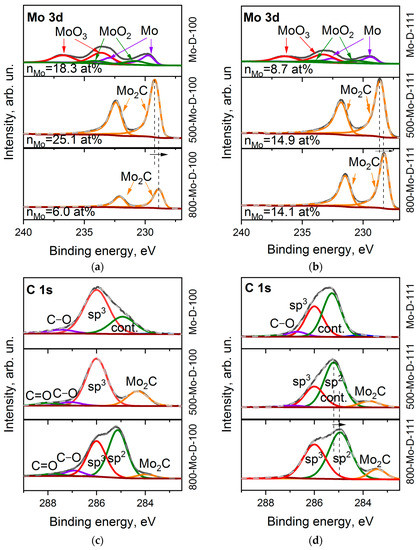 XPS Mo 3d spectra (a,b) and C 1s spectra (c,d) of Mo-D-100 (a,c) and Mo-D-111 (b,d) samples before and after annealing at 500 and 800 °C.