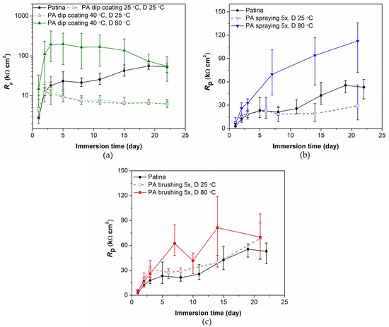 Polarization resistance as a function of immersion time in simulated acid rain for the unprotected patina and patina protected with phosphonic acid (PA) film obtained by (a) dip coating, (b) spraying, and (c) brushing method.
